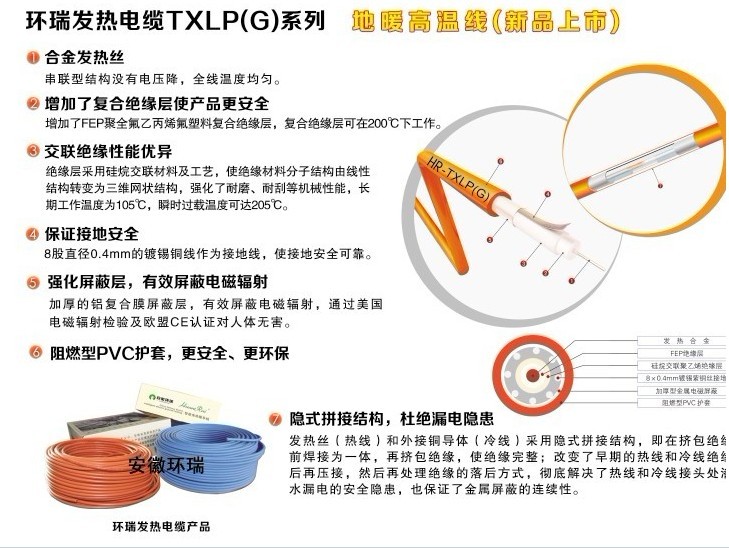 采用雙層絕緣、隱式拼接,包括多股發(fā)熱合金,所述的發(fā)熱合金外依此包覆無色透明氟隆絕緣層、火焰及蒸汽交聯(lián)聚乙烯絕緣層、8*0.4mm鍍錫紫銅絲接地、加厚型金屬電磁屏蔽,阻燃型PVC外護(hù)套。