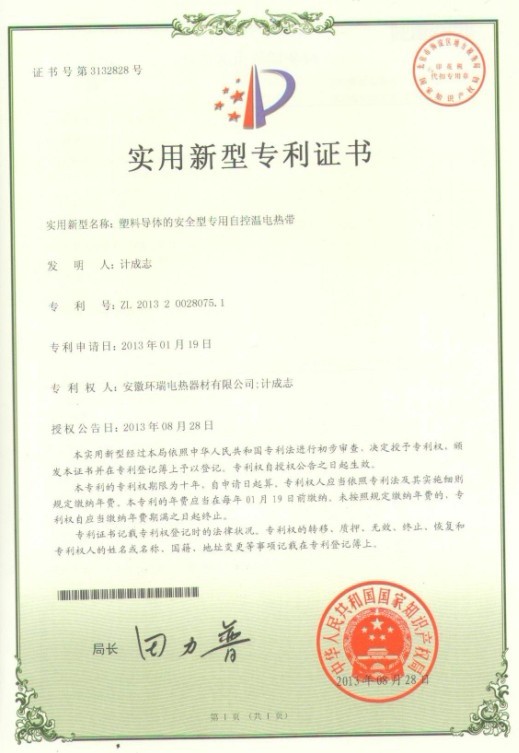 環(huán)瑞自成立研發(fā)小組至科學(xué)技術(shù)中心期間,通過獨(dú)立開發(fā),與合肥工業(yè)大學(xué)建立長(zhǎng)期合作關(guān)系,聘請(qǐng)相關(guān)專業(yè)的技術(shù)專家等模式,投入大量的人力物力。我司以安全,實(shí)用性能為目標(biāo),對(duì)電伴熱帶結(jié)構(gòu)、原材料、生產(chǎn)工藝進(jìn)行創(chuàng)新,最新研發(fā)的“三層共擠自控溫電伴熱帶”“ 塑料導(dǎo)體的安全型自控溫電熱帶”獲得了2項(xiàng)國(guó)家專利證書。我司已獲得了5項(xiàng)關(guān)于自限溫伴熱帶的國(guó)家專利證書,我司伴熱帶的生產(chǎn)技術(shù)已達(dá)到國(guó)內(nèi)先進(jìn)。共計(jì)19項(xiàng)專利。新的專利證書已下達(dá)。
