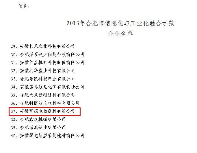 為加快推進(jìn)我市兩化深度融合,發(fā)揮典型示范作用,依據(jù)《合肥市信息化與工業(yè)化融合示范企業(yè)認(rèn)定管理辦法(試行)》和《合肥市第三方企業(yè)信息化公共服務(wù)平臺認(rèn)定辦法(試行)》等文件,經(jīng)企業(yè)申報、縣區(qū)推薦、專家評審和綜合審查,現(xiàn)確定安徽環(huán)瑞電熱器材有限公司,等40家為2013年合肥市 安徽環(huán)瑞將積極響應(yīng)政府的有關(guān)倡導(dǎo):不斷提升自身信息化應(yīng)用水平,切實發(fā)揮示范企業(yè)帶動作用,認(rèn)真總結(jié)信息化建設(shè)經(jīng)驗,積極探索利用信息技術(shù)推動產(chǎn)業(yè)升級轉(zhuǎn)型,發(fā)展新型業(yè)務(wù)模式,培育新業(yè)態(tài),走出一條合肥特色的信息化與工業(yè)化深度融合的“科技環(huán)瑞”的發(fā)展道路,促進(jìn)電伴熱帶,發(fā)熱電纜產(chǎn)業(yè)結(jié)構(gòu)優(yōu)化升級,最終為振奮合肥的經(jīng)濟(jì),做出貢獻(xiàn)!