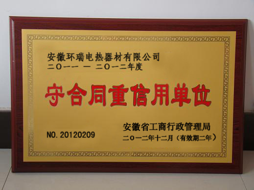 誠(chéng)信是企業(yè)可持續(xù)發(fā)展的基石。十多年來,安徽環(huán)瑞電熱器材有限公司始終秉承“以人為本,以顧客為中心”的核心價(jià)值觀,恪守誠(chéng)信經(jīng)營(yíng)的理念,嚴(yán)格執(zhí)行《合同法》、《公司法》等法律法規(guī),不斷強(qiáng)化合同管理,完善合同管理制度,從根本上保證合同管理和履行的規(guī)范性。同時(shí),大力開展創(chuàng)造“守合同重信用”企業(yè)活動(dòng),營(yíng)造“守合同重信用”的良好氛圍,提高全體職工“守合同重信用”的自覺性和法制觀念,使企業(yè)合同管理不斷走向制度化、規(guī)范化、標(biāo)準(zhǔn)化。2011-2012年公司合同履行率100%。無任何違法、違約、違規(guī)及合同糾紛等不良行為,各合作單位對(duì)安徽環(huán)瑞的合同履行情況也都給予了高度評(píng)價(jià)。