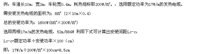 關(guān)于車道融雪化冰,為節(jié)省出資,不用在車道整個(gè)區(qū)域鋪設(shè)加熱電纜,通常裝置在車輪通過的當(dāng)?shù)鼐妥銐蛄?。可選用單位裝置面積功率為200~250W/㎡,并選用帶地上傳感器的溫控器來操控。