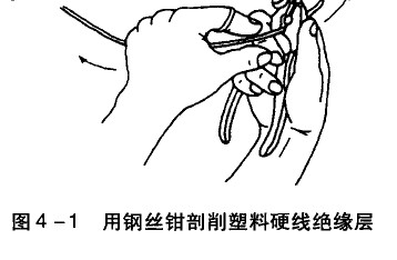 芯線截面為4mm,及以下的塑料硬線,其絕緣層用鋼絲鉗剖削,具體操作方法:根據(jù)所需線頭長度,用鉗頭刀口輕切絕緣層(不可切傷芯線),然后用右手握住鉗頭用力向外勒去絕緣層,同時左手握緊導(dǎo)線反向用力配合動作,如圖4-1所示。