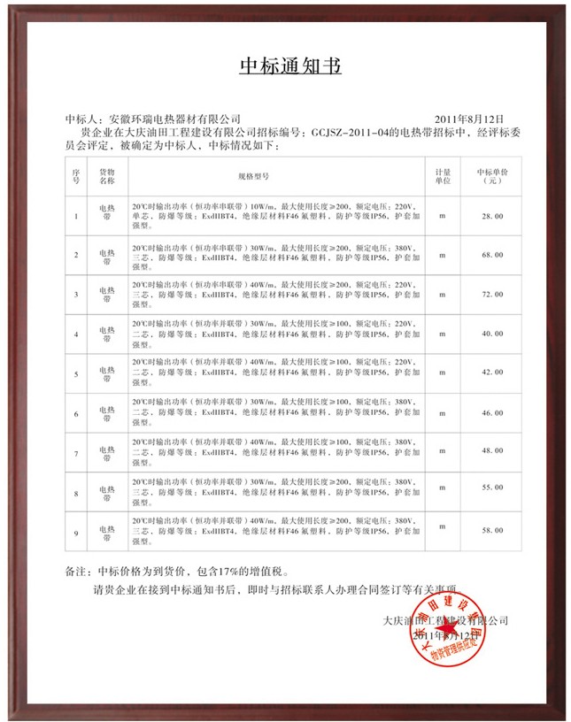 喜報(bào)!安徽環(huán)瑞在總公司領(lǐng)導(dǎo)的關(guān)懷下、在以優(yōu)秀經(jīng)理徐紅兵同志為帶領(lǐng)的大慶辦事處全體員工的辛勞下,經(jīng)過不懈努力,在與全國各地20余家同行業(yè)企業(yè)的競爭中,脫穎而出,于2011年7月30號拔得頭籌,中標(biāo)成功!成為大慶油田建設(shè)集團(tuán)卓越中標(biāo)單位、大慶油田石油管理局入網(wǎng)單位!