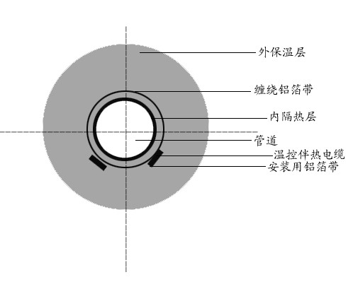 由于蒸汽掃線時(shí)間相對(duì)較短。一般控制在30分鐘左右??刹捎孟聢D雙層保溫結(jié)構(gòu)來(lái)保證使用。一般來(lái)說(shuō),這種結(jié)構(gòu)的內(nèi)層保溫厚度為5-10mm.在內(nèi)保溫層外加包鋁膠帶,鋁膠帶上敷設(shè)自控溫電熱帶。每毫米內(nèi)層保溫層可使掃線溫度減低10℃左右,或采用隔離支架,每米1—2只,效果也較理想。當(dāng)然,在掃線時(shí)必須停止通電,管線熱損失仍按常規(guī)設(shè)計(jì),保溫層厚度只能按外層為計(jì)算厚度。