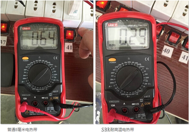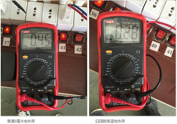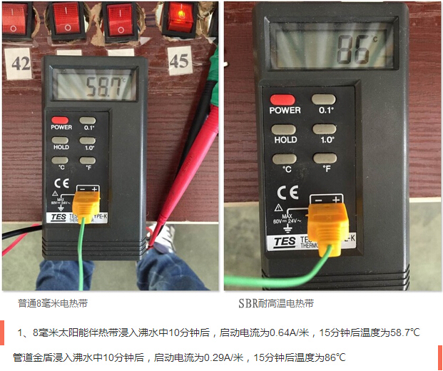 SBR型耐高溫電伴熱在模擬沸水管道狀態(tài)下使用后,啟動(dòng)電流基本無變化,產(chǎn)品性能更加穩(wěn)定,有效地降低了伴熱帶起火燃燒的概率,提高了使用壽命,發(fā)熱溫度更高,更適合太陽能管道伴熱。