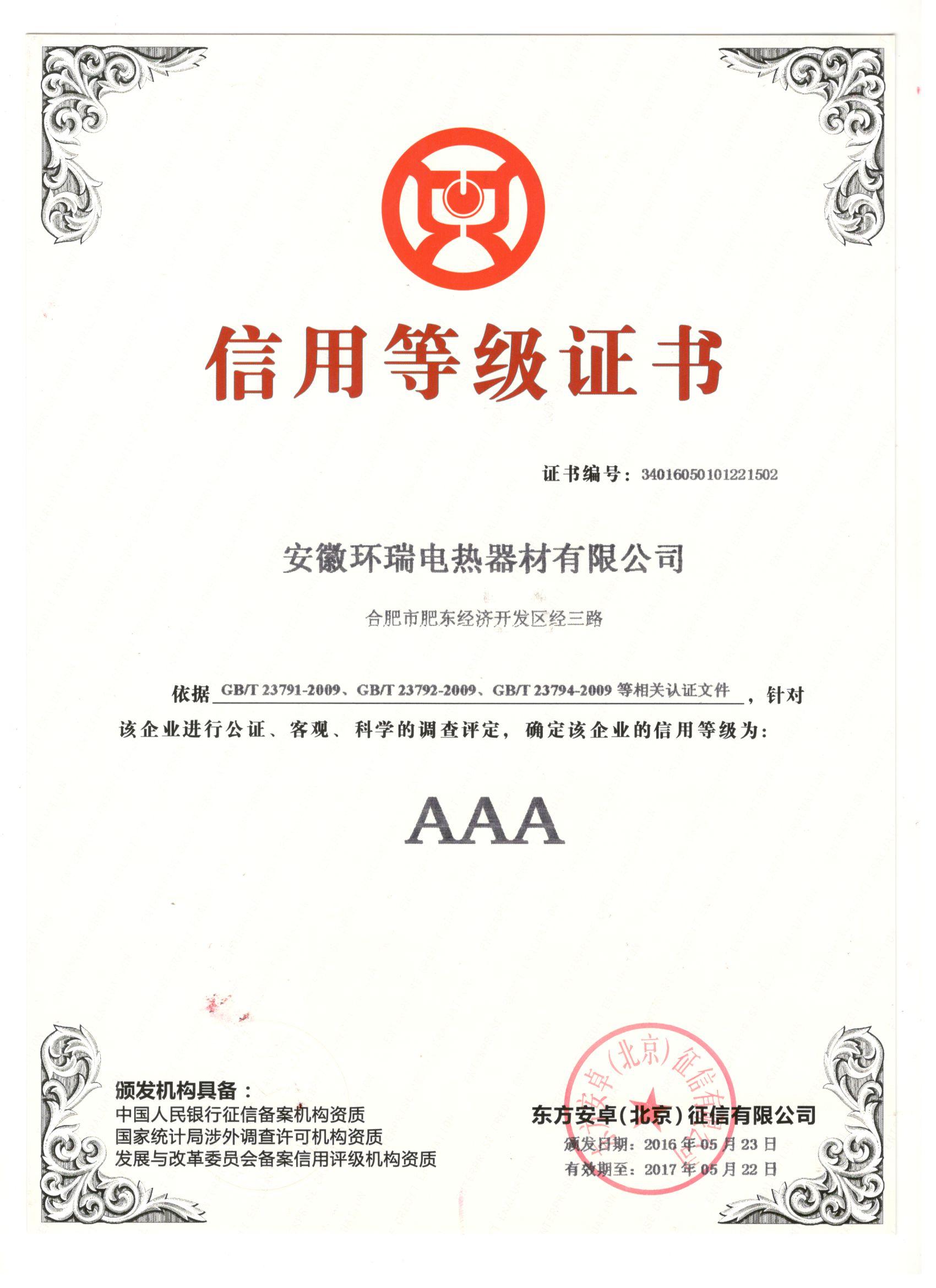 誠信是中華民族的傳統(tǒng)美德,誠信是一個(gè)企業(yè)立命之根,誠信是一個(gè)企業(yè)發(fā)展之本。“AAA”作為一個(gè)誠信的標(biāo)志,是對(duì)企業(yè)基本信息、綜合指標(biāo)、經(jīng)營發(fā)展、信用記錄等各個(gè)方面行為全方位的評(píng)價(jià),熱烈慶祝安徽環(huán)瑞電熱器材有限公司榮獲 “企業(yè)AAA級(jí)信用等級(jí)證書”。